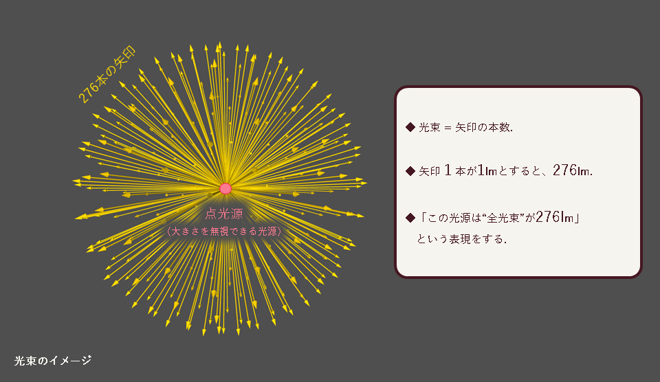 矢印は全部で$276$本なので、この光源からは全部で$276\,\mathrm{lm}$の光を放っていることになる。これを、「全光束$276\,\mathrm{lm}$の光源(器具)」と言ったりする。全光束とは、ある光源から放たれる全ての光束のことである。