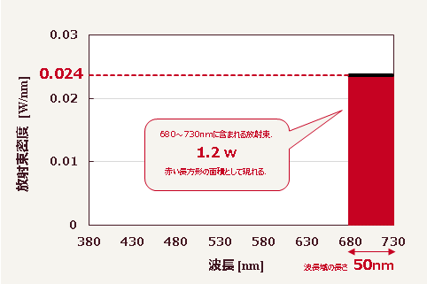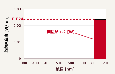 $680\,\mathrm{nm}$から$730\,\mathrm{nm}$までの赤色波長域に含まれる放射束$1.2\,\mathrm{W}$を計測し、それを波長域の長さ$50\,\mathrm{nm}$で割った放射束密度$0.024\mathrm{W/nm}$を求め、横軸に波長・縦軸に放射束密度をとったグラフだ。