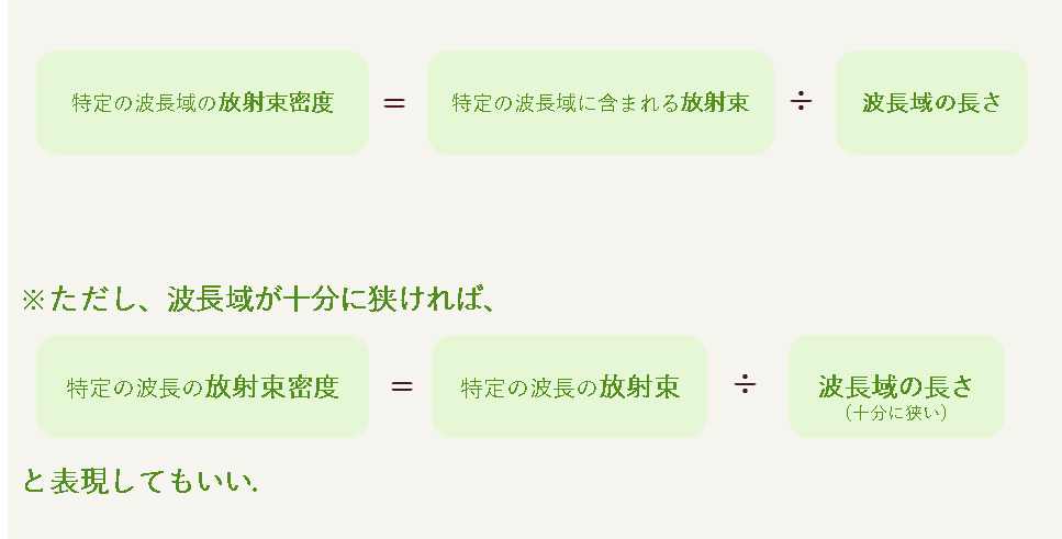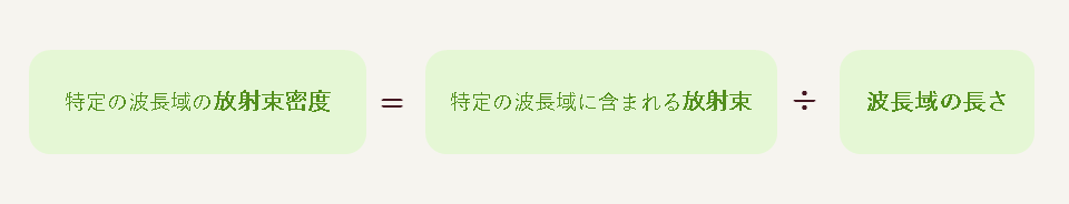 - その放射量を設定した波長域の長さで割ることで放射量の密度を求め、