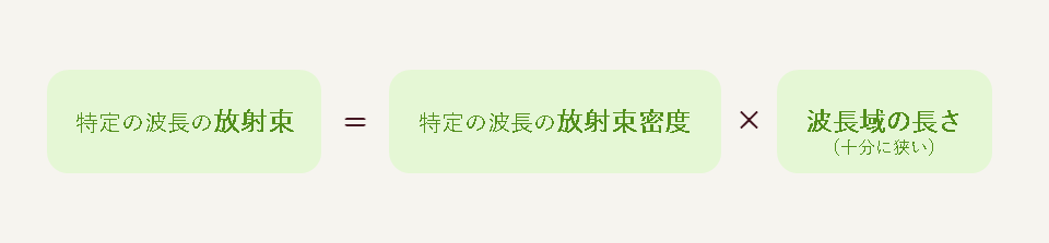このように、ある特定の波長の放射束は、その波長における放射束密度が分かっていれば求めることができる。とういよりも、放射束は放射束密度を使わなければ表現できないのだ(レーザー光線などの特殊な光源は除く)。