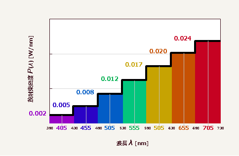 筆者が適当に作ったグラフであるが、一応、白熱電球の分光分布を模している。一番左、紫の部分は、波長$405\,\mathrm{nm}$を中心に$50\,\mathrm{nm}$の波長域を設定していて、その波長域での放射束密度は$0.002\,\mathrm{W/nm}$となっている。つまり、